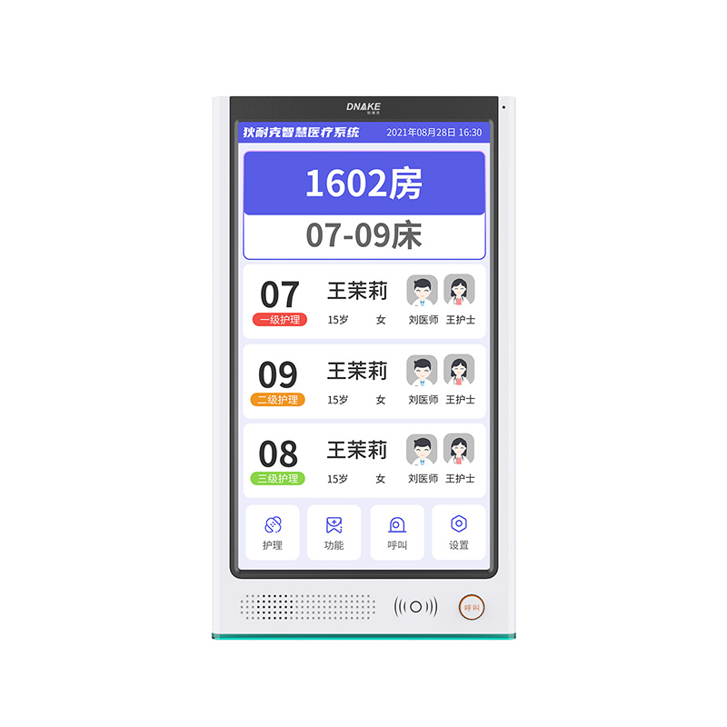 創(chuàng)新設(shè)置在病房門口的終端設(shè)備,主要用于顯示病房相關(guān)信息,內(nèi)置簡易醫(yī)護(hù)工作站,支持病房床位一覽、患者動態(tài)跟蹤、呼叫對講、增援求救等多種呼叫類型,信息齊全,及時響應(yīng)醫(yī)護(hù)需求,實現(xiàn)智能化醫(yī)護(hù)管理。