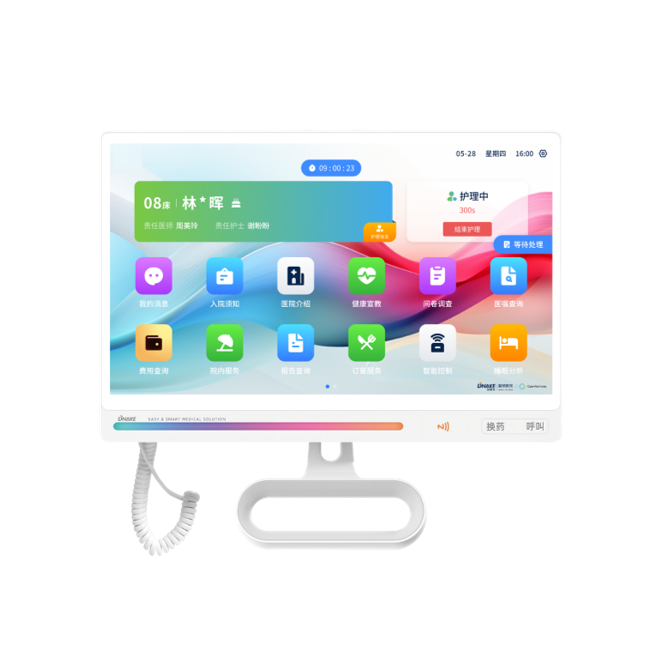 1)采用多點(diǎn)觸控電容觸摸屏,超薄面板,含手持呼叫手柄,安裝在病床上方的多功能擺臂上,每個病床一臺,用于呼叫護(hù)士站,患者基本信息展示。